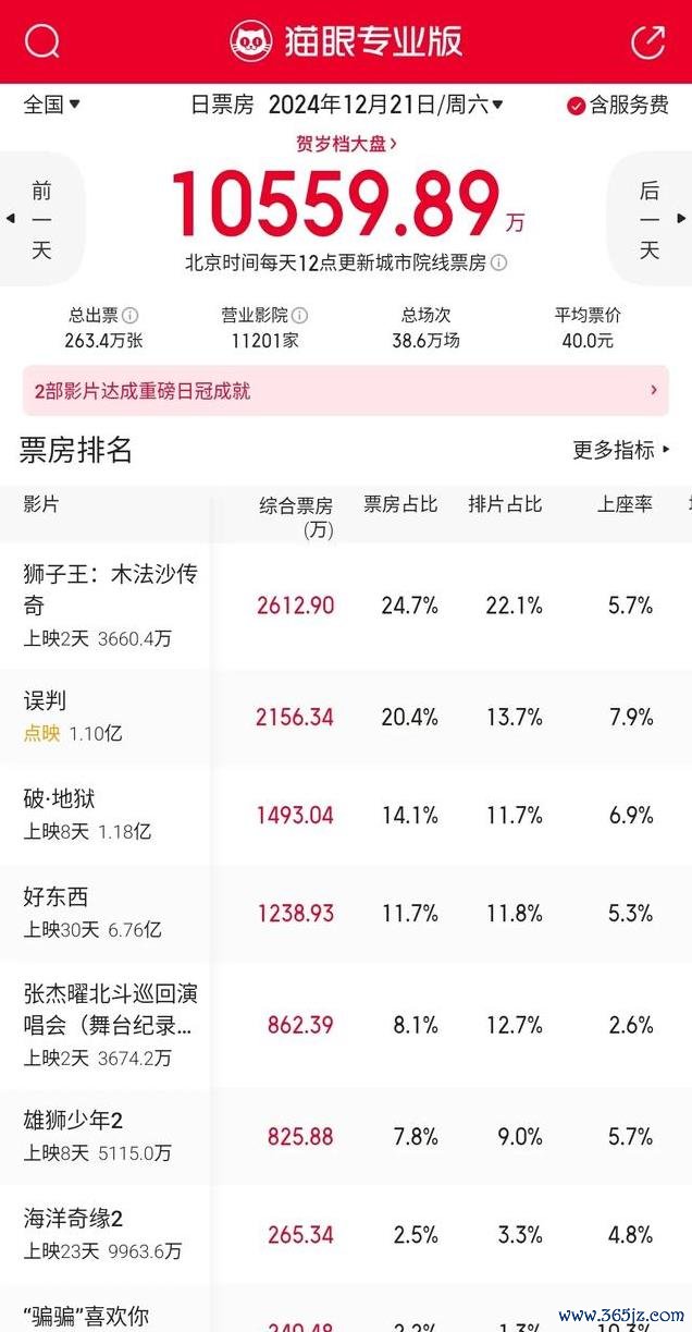 【数字飙榜体育游戏app平台,单日票房】 TOP1 巴里·詹金斯导演,亚伦·皮埃尔、小凯文·哈里森、蒂凡尼·布恩和卡吉锁·莱迪加配音的《狮子王:木法沙外传》单日票房2612.9万,位列单日票房榜冠军,票房占比24.7%,排片占比22.1%,上座率5.7%,再上映两天累计总票房3660.4万东谈主民币。 TOP2 黄百鸣和甄子丹监制,甄子丹自导自演,张智霖、吴镇宇、许冠文和张禀赋领衔主演,郑则仕和刘江主演,吕良伟和郑浩南稀薄出演罪犯作为片《误判》点映当日票房2156.34万,位列单日票房榜第二名