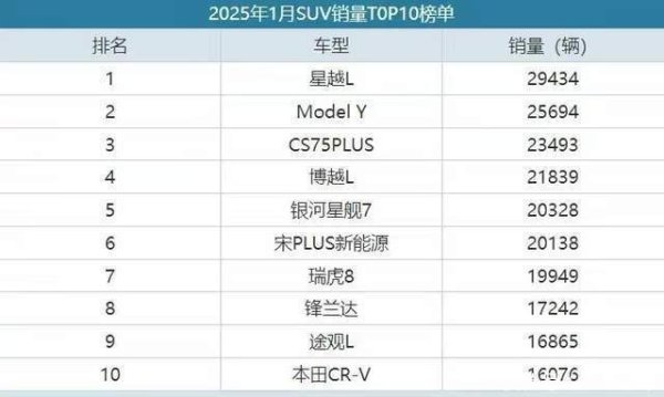 2025年1月,国内SUV商场在春节假期与浪掷不雅望厚谊访佛的布景下,呈现出“自主领跑、油电博弈”的显赫特征。尽管乘用车举座销量同比下滑,但SUV细分商场以50%的销量占比展现了较强韧性,近期1月SUV车型的销量数据也曾发布开云(中国)kaiyun网页版登录入口,接下来咱们就来望望各款车型的进展吧。 O.1 星越L 销量:29434辆 1月星越L以29434辆的收货初次登顶,展现了自主品牌在燃油车商场的苍劲竞争力。其到手中枢在于居品力,整车除了2.0T燃油版以外还推出了雷神混动系统,兼顾能源与