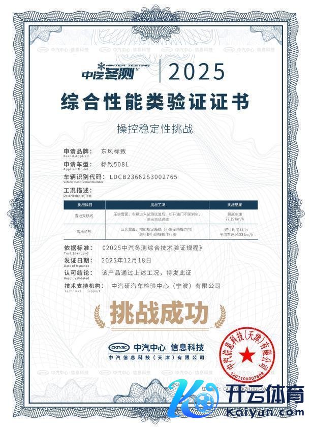 12月18日,在中国汽车时间盘问中心主持的“2025极寒驾控安全主题时间考据”中,东风雪铁龙凡尔赛C5 X与东风标致508L凭借超卓的操控剖析性,双双斩获“操控剖析性挑战”考据文凭。其中,凡尔赛C5 X在雪地爬坡与雪地高速爆胎测试中进展正经,东风标致508L则在雪地双移线与雪地蛇形测试中展现出精确的操控功底。这一成绩开云(中国)kaiyun网页版登录入口,充分印证了两款车型塌实的整车品性与法系品牌在极点环境下的安全时间底蕴。