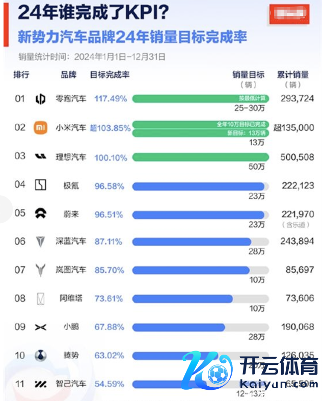 跟着各家车企继续公布12月的销量数据,2024年全年的销售情况也全盘轩敞,关于各家车企而言,年头制定的场地成为接洽全年恶果的蹙迫办法,近期易车网公布了2024年新势力品牌KPI完成率的排名榜,从榜单来看,全年仅零跑汽车、小米汽车和理念念汽车三家完成了年头场地,接下来咱们就一说念来望望各自的弘扬吧。