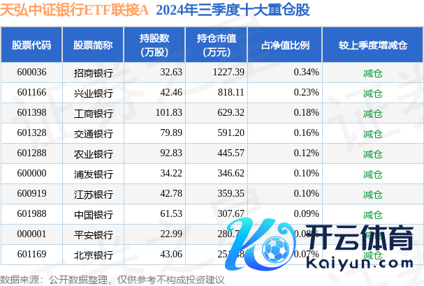 本站音尘体育游戏app平台,11月22日,天弘中证银行ETF聚首A最新单元净值为1.4943元,累计净值为1.4943元,较前一往昔日着落2.1%。历史数据披露该基金近1个月着落3.44%,近3个月飞腾3.32%,近6个月飞腾6.68%,近1年飞腾25.72%。该基金近6个月的累计收益率走势如下图: 天弘中证银行ETF聚首A为指数型-股票基金,笔据最新一期基金季报披露,该基金钞票成就:股票占净值比2.21%,债券占净值比0.02%,现款占净值比6.57%。基金十大重仓股如下: 该基金的基金司理