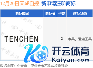 本站音讯,字据企查查数据裸露,近日浙江天成自控股份有限公司新提交2件商标注册肯求。商标肯求细目如下: