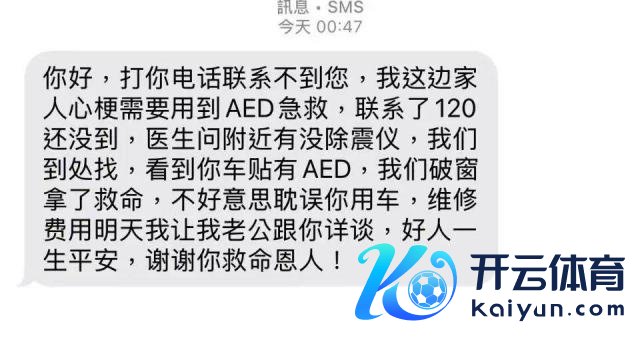 2019 年,叶先生的父亲曾经因腹黑不适受到了好心东说念主的赈济,自其时起他运转意志到急救竖立的首要性。2024 年 6 月,叶先生花一万多元采购了一台 AED 竖立,为了匡助更多东说念主,叶先生把 AED 配备在了车上,并在车窗上贴上象征,"车内配有 AED,可良友车门,进攻情况可破窗使用。"