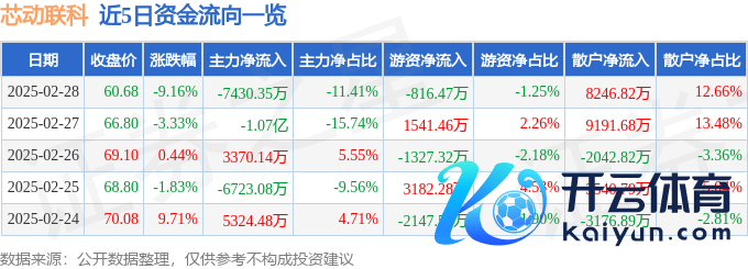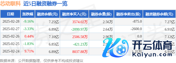 本站音信开yun体育网,拒绝2025年2月28日收盘,芯动联科(688582)报收于60.68元,下降9.16%,换手率4.22%,成交量10.42万手,成交额6.51亿元。 2月28日的资金流向数据方面,主力资金净流出7430.35万元,占总成交额11.41%,游资资金净流出816.47万元,占总成交额1.25%,散户资金净流入8246.82万元,占总成交额12.66%。 近5日资金流向一览见下表: 芯动联科融资融券信息涌现,融资方面,当日融资买入1.07亿元,融资偿还7174.51万元,融