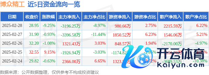 本站音信,甩手2025年2月28日收盘,博众精工(688097)报收于28.95元,着落9.25%,换手率2.7%,成交量11.98万手,成交额3.56亿元。