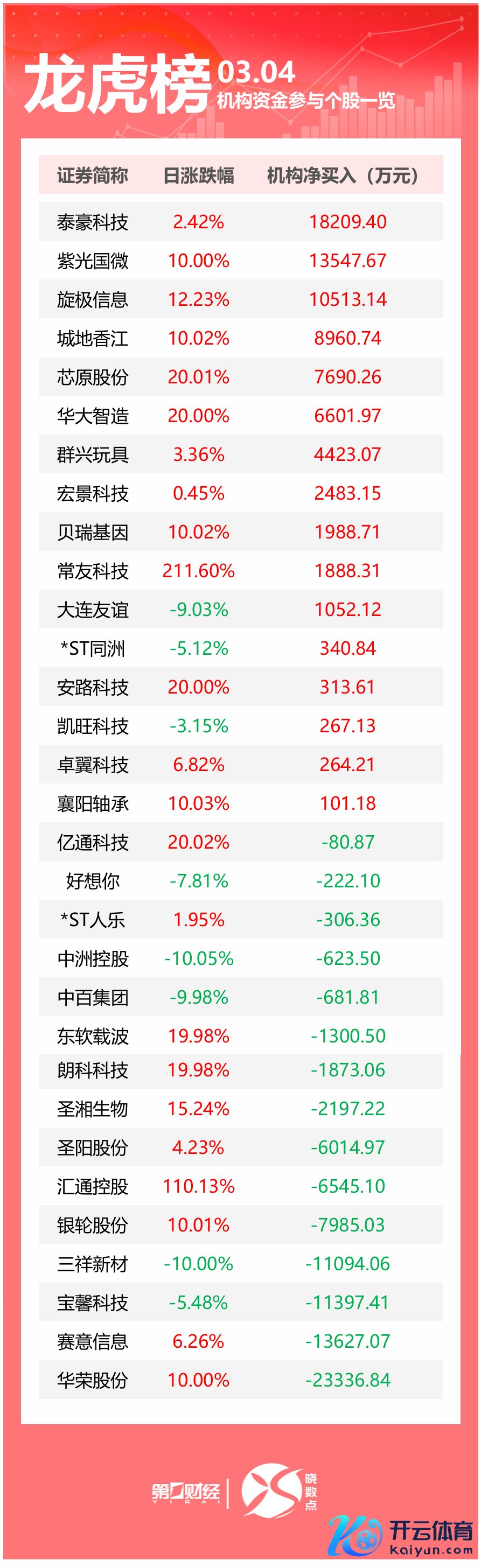 3月4日龙虎榜中,共31只个股出现了机构的身影,16只股票呈现机构净买入,15只股票呈现机构净卖出。当天机构净买入前三的股票永诀是泰豪科技、紫光国微、旋极信息;当天机构净卖出前三的股票永诀是华荣股份、赛意信息、宝馨科技。
