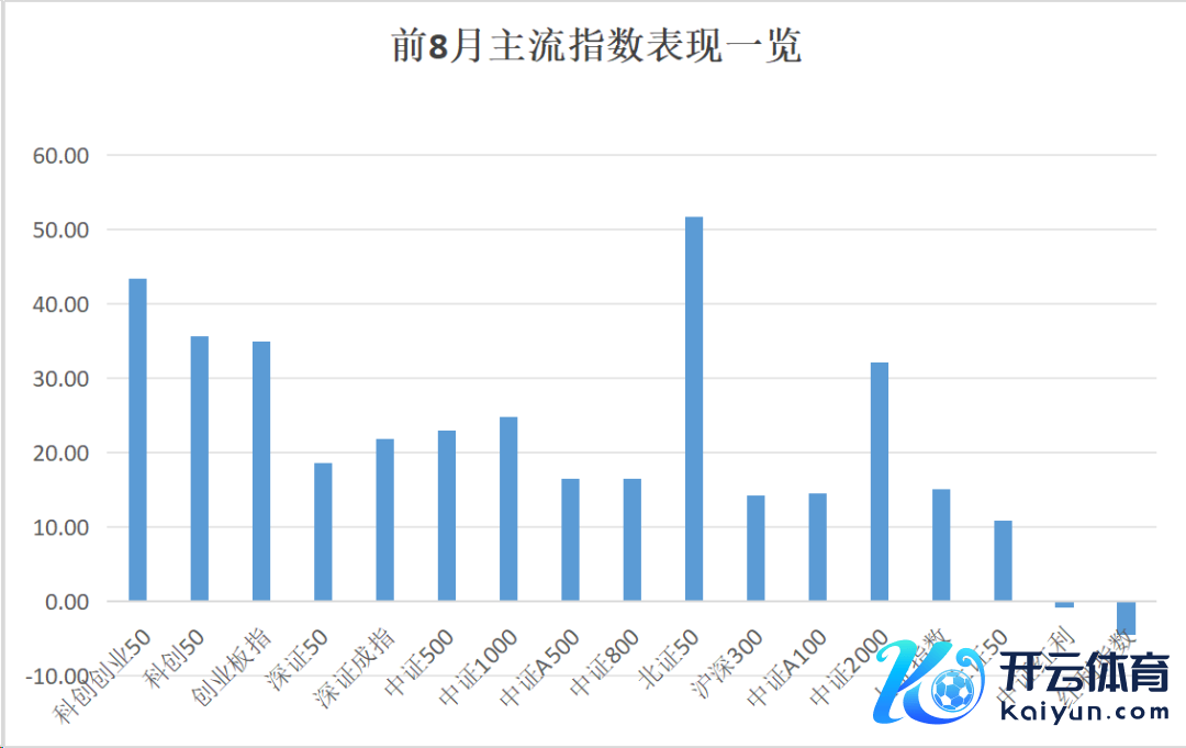 具体来看,主流指数前8月总体演出高涨行情,其中北证50年内涨幅达到51.49%,阐发最佳;科创创业50、科创50、创业板指、中证2000等指数阐发强势,涨幅超30%,仅红利指数出现小幅着落。