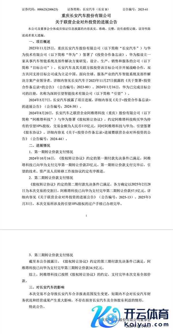 2025年2月,阿维塔科技向华为支付结束第二期转让价款57.5亿元,3月31日,这次走动所波及的引望10%股权的过户手续已办理结束。