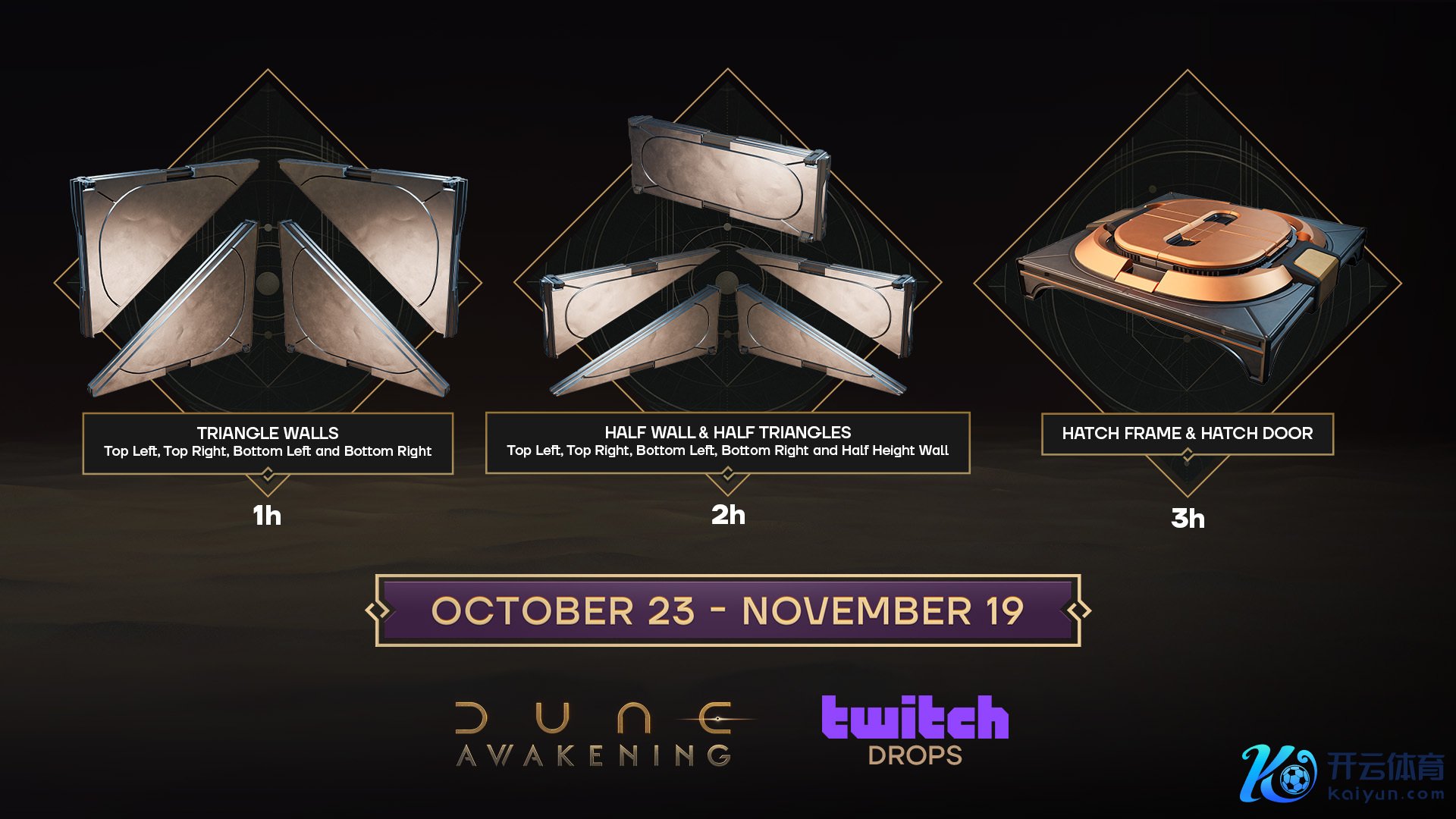 亲爱的千里睡者们欧洲杯体育, 不雅察者立场建材执续膨大!即日起至11月19日,收看Twitch平台上任何相沿掉落的《Dune: Awakening 沙丘:醒觉》直播,即可取得新建材。 这些建材可与任何其他诱骗立场搭配使用,解放组合,让您在厄拉科斯策划出唯一无二的行径基地。 您可取得的新不雅察者建材包括: 三角墙 三角半墙与半高墙 舱口框与舱口门 若是您是Twitch掉落的生手,请按以下次序操作: 登录https://www.duneawakening.com/account ,