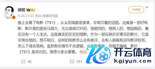 9 月 28 号这天开云(中国)kaiyun网页版登录入口,电影《731》刚好上映 11 天,灯塔专科版的票房数字停在 14.64 亿 —— 不算差,但明眼东说念主齐能看出潜力不及,典型的高开低走。 更奇幻的是网上的评价,几乎像开了冰火两重天口头:一边是 "退钱" 声浪把官博冲得消一火,另一边却有百万粉博主拍着桌子力挺,直言 "想欠亨何如有东说念主下得去笔骂"。 这事得从 26 号那位博主的发言提及。他看完片后心理挺欢腾,连说影片 "重新到尾紧凑,千里重得喘不外气",额外点出片中 "马路大"