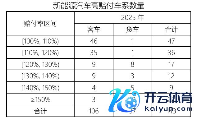 2025年,我国新动力汽车限制车扫数目429个。其中,赔付率朝上100%(尚未辩论财险公司普通计算贬责用度本钱)的高赔付车系有143个,较上年增多6个,其中客车106个、货车37个。