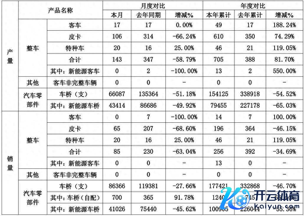 4月3日,朝阳股份(600303)发布公告,2026年3月,公司整车产量143辆,同比下降58.79%;今年累计产量705辆,同比增长81.70%。3月整车销量达85辆,同比下降63.04% ;今年累计销量256辆,同比下降34.69%。 其中,新动力客车3月产量和销售均为0辆,今年累计产量13辆,同比增长550.00%;今年累计销售13辆。客车非完满车辆的产、销量3月均为零。 辽宁朝阳汽车集团股份有限公司所以汽车整车、车桥及零部件为主营业务的大型汽车企业集团,总部位于辽宁丹东。公司领有“黄海