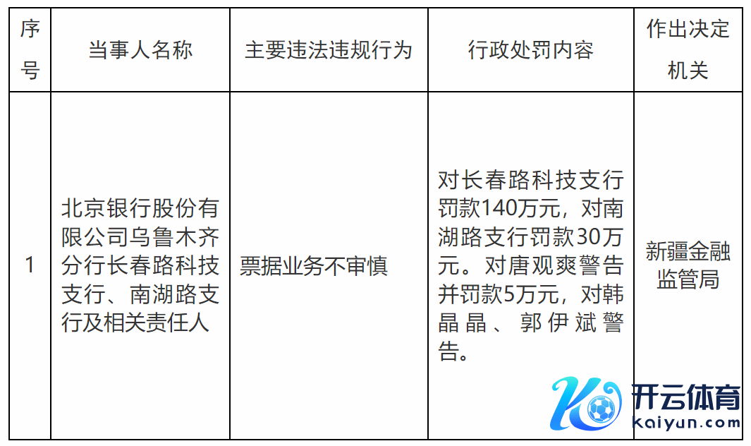 4月10日,新疆金融监管局发布了罚单,剑指北京银行股份有限公司乌鲁木皆分行长春路科技支行、南湖路支行及相干牵累东谈主。